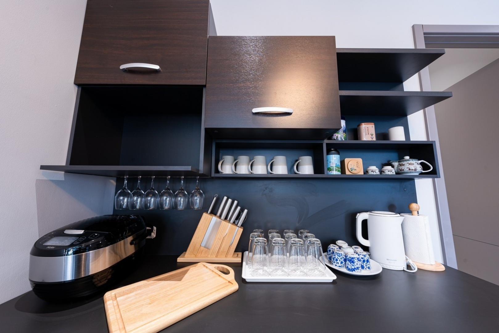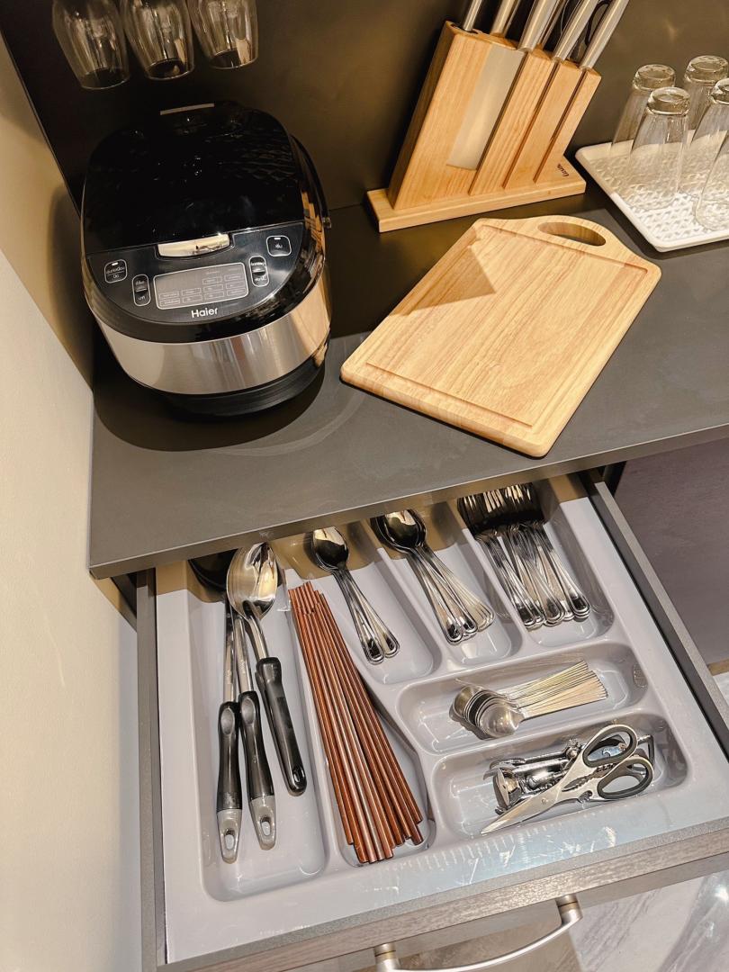 อุปกรณ์ครัวมีตามนี้: หม้อ กระทะ จานชาม ช้อน แก้วน้ำ เขียง มีด หม้อหุงข้าว ครก ซึ้ง ถังน้ำแข็ง ตู้เย็น เตาแก๊ส