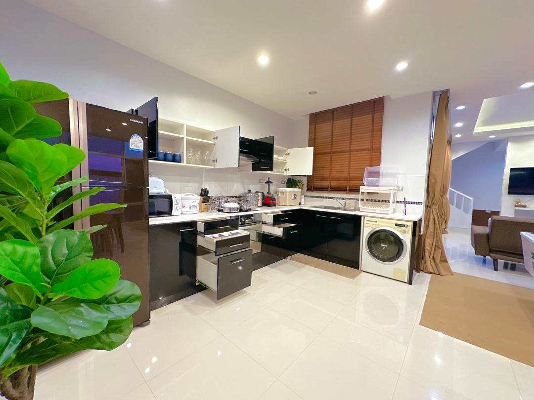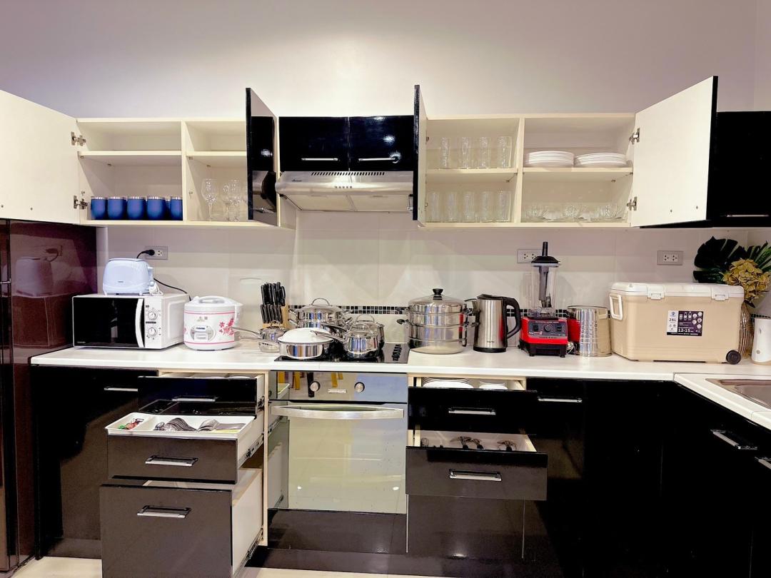 - อุปกรณ์ครัวครบ standard จาน ชาม แก้วน้ำ แก้วไวน์ ตู้อบไมโครเวฟ กาน้ำร้อน เตาปิ้งย่าง BBQ