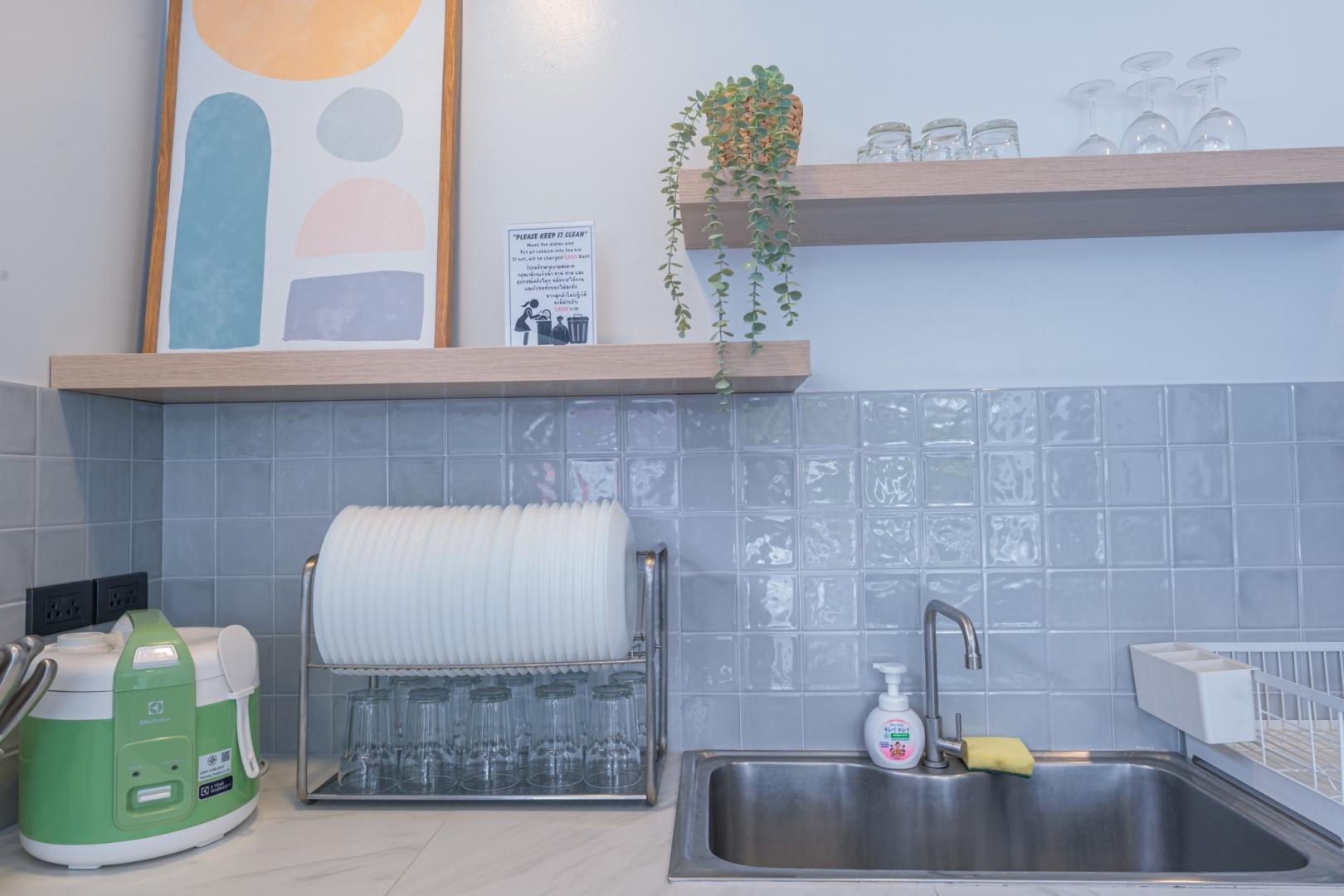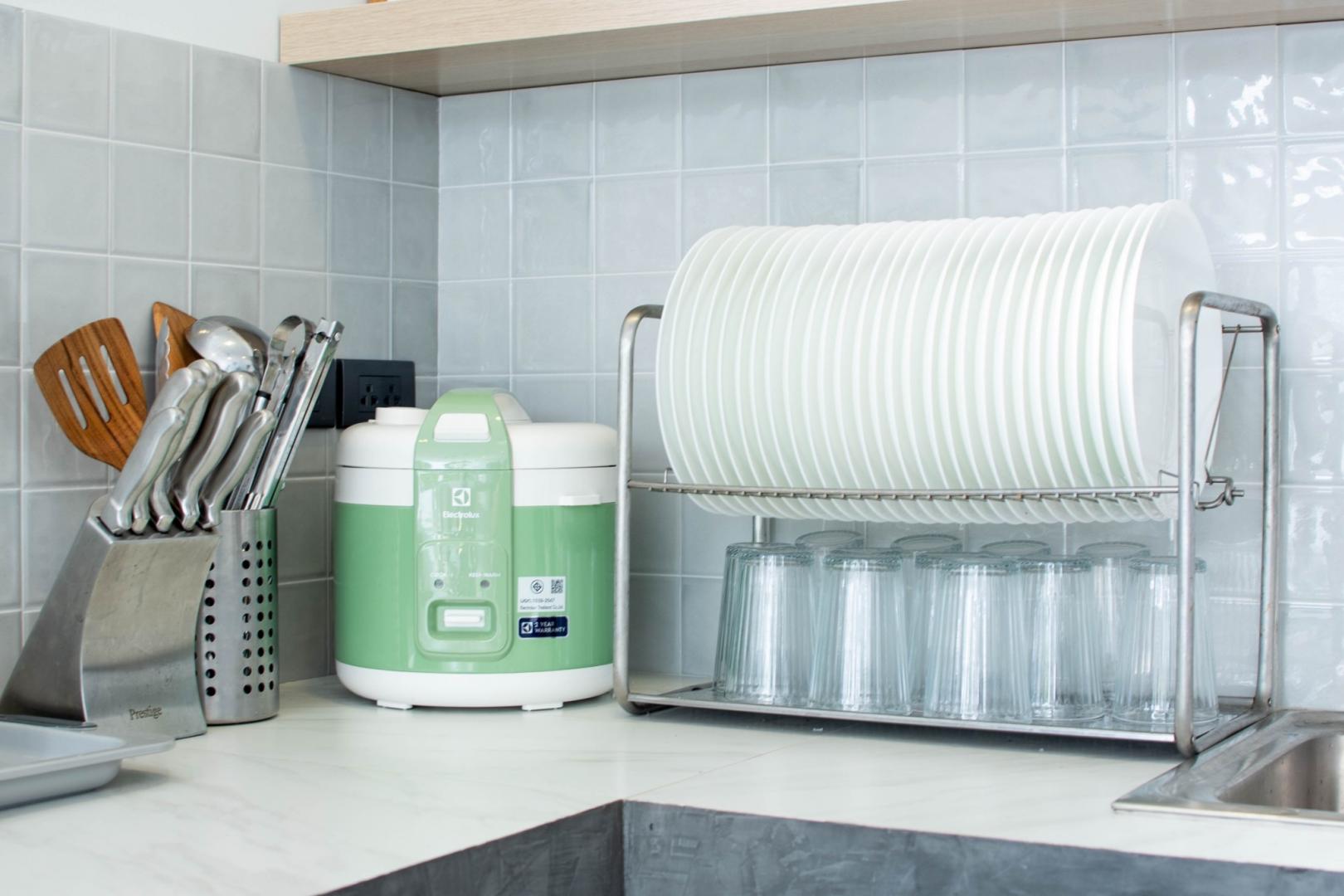 • หม้อ กระทะ จานชาม ช้อน แก้วน้ำ เขียง มีด หม้อหุงข้าว ครก ไมโครเวฟ ซึ้ง ถังน้ำแข็ง เตาไฟฟ้า หม้อชาบู กาต้มน้ำร้อน